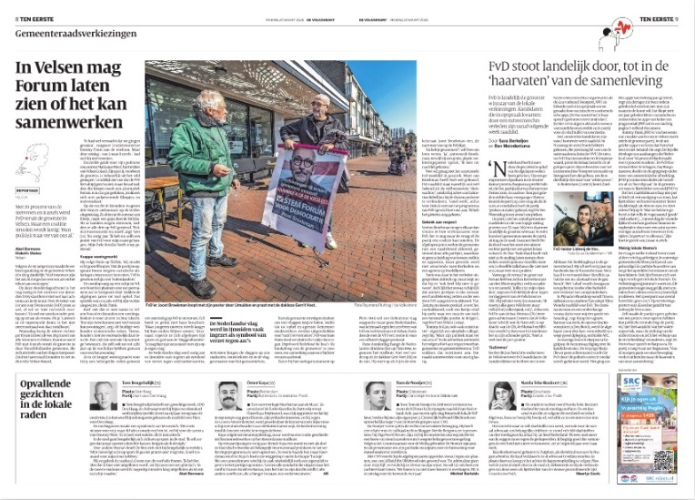 Met een zo ongunstige mogelijke foto van de FvD-lijsttrekker. Die linkerkop is trouwens bijzonder goed getroffen: "Jullie moeten geboycot worden, en die oproep is het bewijs dat jullie niet kunnen samenwerken". De Vuilniskrant in de notendop. De volgende dag (de Volkskrant, 21-03-2026):