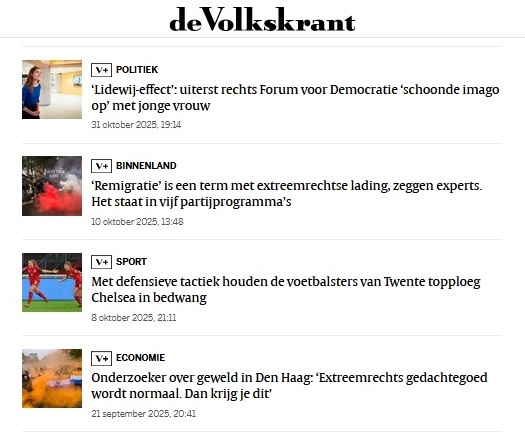 Klopt. Daarom onderzoekt ze ook geen "extremisme", maar "extremisme van rechts". In een eerste formulering van de introductie van dit artikel werd begonnen aldus: In Nederland wordt ook gedaan aan wetenschappelijk onderzoek naar extremisme. Waarvan er drie soorten bestaan. In alfabetische volgorde zijn dat: islamitisch, links, rechts. Bij de meer wetenschappelijke schikking op aantal en ernst is die volgorde: links, islamitisch, rechts. Niet wetenschappelijk maar gewoon uit het nieuws zijn de opvallendste voorbeelden: - links: aanslagen op Makro-winkels (stuk of vijf), aanslagen op Shell-stations (een stuk of vijf), aanslag op Aad Kosto, aanslag op Hans Janmaat, aanslag op Pim Fortuyn. - islamitisch: aanslag op Theo van Gogh door Mohammed Bouyeri, aanslag op burgers in Utrecht door Gökmen Tanis, en aanslag op burgers in Den Haag door Malek Fostok. - rechts: aanslag op het grasveld van een moskee in Enschede door vier dronken cafébezoekers met een hekel aan de islam. Deze verdeling in aanslagen door extremisme zou wetenschappelijk gezien weerspiegeld moeten worden in de aandacht besteed aan de diverse velden. Hier is de realiteit: - Nikki Sterkenburg (NCTV): onderzoekt rechts - Sarah de Lange (UvA) onderzoekt rechts. - Léonie de Jonge (RUG): onderzoekt rechts. Het onderzoek van Sarah de Lange is behandeld elders Waarmee nog even verder gaan, want de directe aanleiding voor deze analyse is nog niet behandeld. Dat was de bijdrage van mevrouw Léonie de Jonge aan een nieuwe aflevering van het verschijnsel: "Hoe bevorderen we de zaak van Forum voor Democratie zo goed mogellijk". Want, zoals mevrouw De Jonge in het NRC heeft gesteld: radicaal rechts en extreemrechts kan alleen leven bij de gratie van de zuurstof van publiciteit haar verschaft door de media (noot: deze redactie meent zich te herinneren dat ze daar ergens een kleine toevoeging bij heeft gegeven ("Er zijn ook andere redenen om FvD te stemmen"), maar zulk soort "nuance" wordt door de media altijd in een donker hoekje gezet, wat mevrouw De Jonge inmiddels donders goed moet weten, dus heeft ze er geen bezwaar tegen, dus laten wij het maar helemaal weg). Dus: Zonder media-aandacht geen PVV en FvD. En alweer doet mevrouw De Jonge dus mee aan het promoten van de zaak van de PVV en het FvD. Op deze manier (de Volkskrant, 22-11-2021, door Sacha Kester):